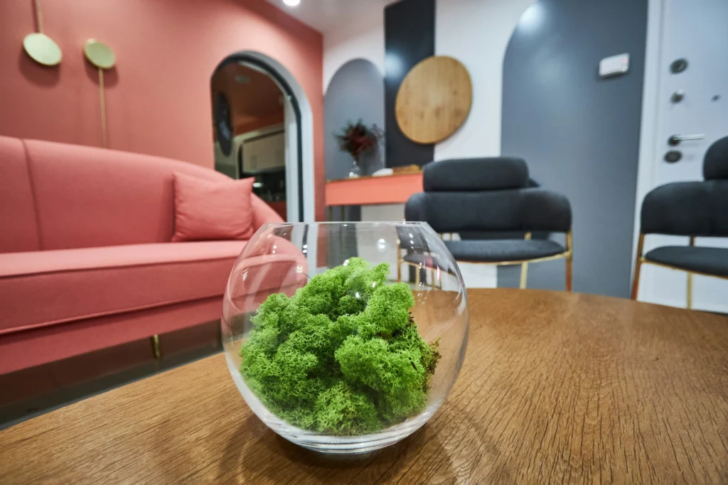 • 테이블 위에 유리볼 안에 이끼 오브제를 배치.